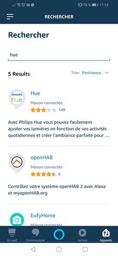Une fois dans l’application Alexa, ouvrez le menu principal et choisissez « Skills et jeux ». De là, lancez la recherche « Hue » et lancez l’activation du skill.