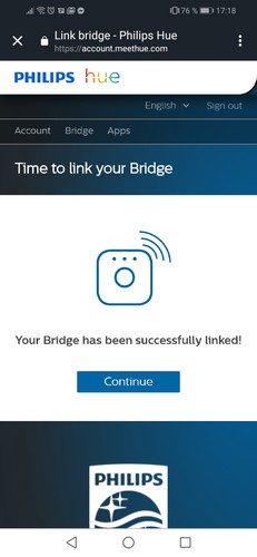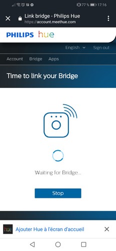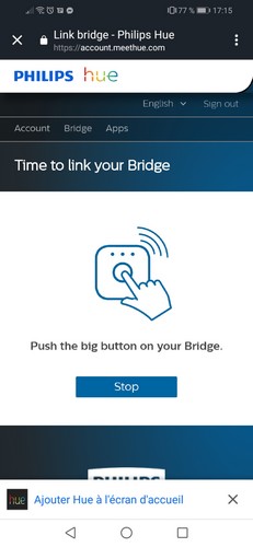 Il vous sera demandé une association de compte avec un compte Philips ou Gmail, puis d’appuyer sur le bouton du pont (d’où la proximité suggérée plus haut) et de valider les autorisations.