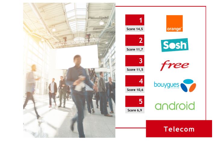 Le classement était réalisé par secteurs d’activité et dans celle qui était réservée aux télécoms, Orange décroche la première place haut la main avec un score de 14.5. La deuxième place revient à Sosh qui décroche un score de 11.7 suivi de très près par Free avec son score de 11.5. Bouygues quant à lui est quatrième et SFR est absent du Top 5 puisque la cinquième place revient à Android.