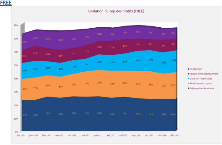 De quoi se plaignent le plus les abonnés Free ? L’AFUTT a réalisé une étude complète sur l’évolution des principaux motifs de plaintes chez les opérateurs dont Free. Fin 2020, c’est donc, comme pour ses concurrents, les problèmes d’interruption de service qui ont représenté la majorité des insatisfactions avec 24% de plaintes reçues en décembre. A noter cependant que la part de plaintes est plutôt stable, avec une légère hausse durant le confinement.