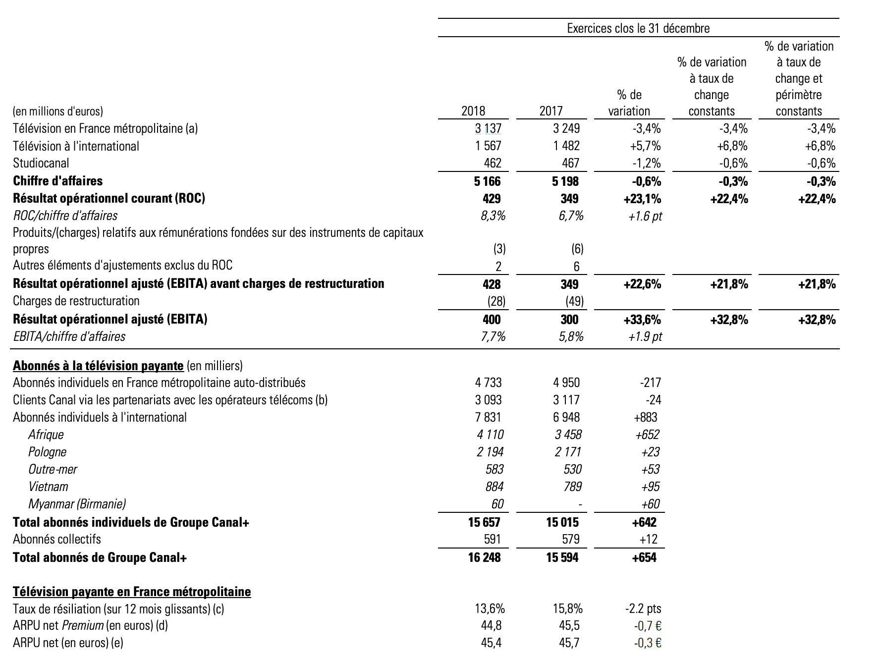 Conséquence de ces mauvais résultats, le chiffre d’affaires de la télévision en France métropolitaine recule de 3,4 % à 3 137 milliards d’euros. La filiale de Vivendi explique notamment ce repli "par la baisse du parc d’abonnés à Canalplay et par l’arrêt de la commercialisation de l’offre Canalsat au profit des nouvelles offres Canal et des abonnements en partenariat avec les opérateurs télécoms."