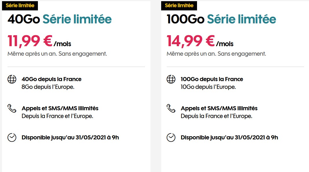 Jusqu’au 31 mai 2021, Sosh propose des forfaits mobiles 40 et 100 Go (débit réduit au-delà) à 11,99 et 14,99 euros par mois. La marque d’Orange précise “même après un an”, concernant les tarifs promotionnels.