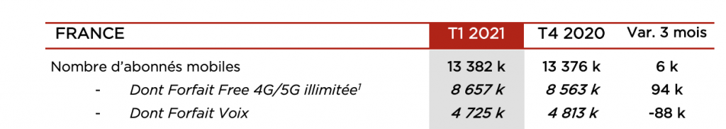 Son forfait 4G/5G illimitée continue également de progresser, avec un gain de 94 000 abonnés nets sur le trimestre. A fin mars 2021, ils représentaient 64,7% de la base d’abonnés mobiles, contre 62,1% 12 mois auparavant. Free Mobile compte ainsi 13,4 millions d’abonnés mobiles, dont 8,7 millions d’abonnés 4G et 5G. Côté revenus sur ce segment, l’opérateur affiche une hausse de 3,4% de son chiffre d’affaires, et ce “malgré l’impact négatif de la crise Covid-19 sur les revenus internationaux”. L’ARPU progresse quant à lui de 2,7% à 10,8 euros, soit une croissance modérée comparée au trimestre précédent (6,5%) “qui traduit une baisse des revenus hors forfaits plus prononcée (-15,2% contre -3,0% au T4 20) et, dans une moindre mesure, une intensité concurrentielle plus forte en début d’année sur les offres sans terminaux.”
