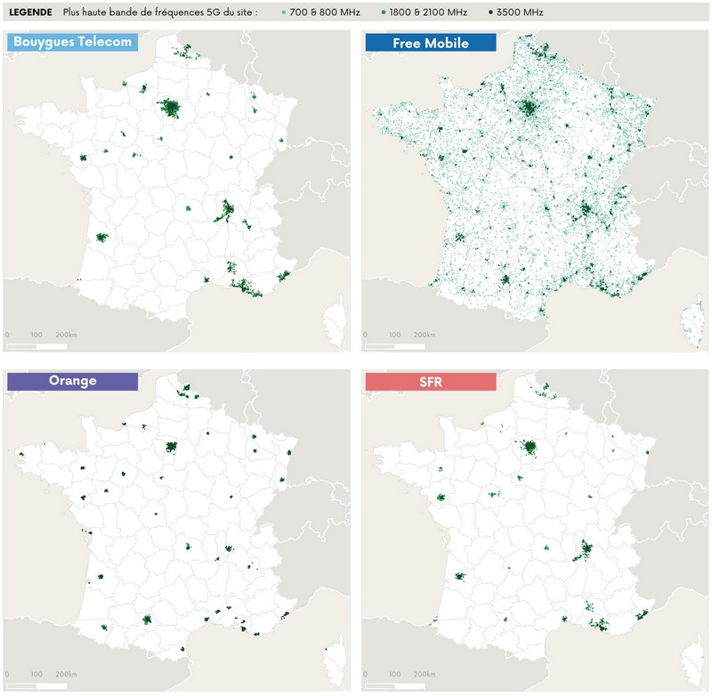 Si Free est premier en nombre des sites 700 MHz avec 8 798 sites, Orange s’empare de la première place concernant les sites 3,5 GHz avec 1 241 sites. Free n’est toutefois pas très loin avec 1 007 émettant sur cette bande reine. Bouygues Telecom et SFR restent loin derrière avec 629 et 558 sites respectivement.