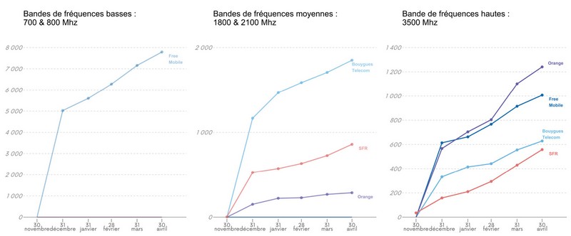 Sur les plus 14 000 sites ouverts en 5G, 3 435 sites émettent sur la bande 3,5 GHz, la fréquence reine offrant les meilleurs débits. Leur nombre est passé d’environ 2 800 au 31 mars à 3 435 au 30 avril.