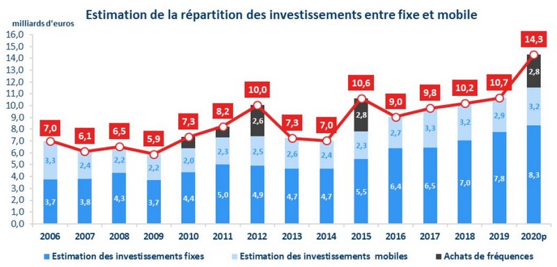 Cet environnement difficile n’a en revanche pas impacté les investissements des opérateurs. 2020 s’est traduit par des investissements à hauteur de 14,3 milliards d’euros, dont 2,8 milliards injectés dans l’achat des fréquences 5G dans la bande des 3,4-3,8 GHz. Des acquisitions de fréquences qui ont d’ailleurs permis d’atteindre un nouveau record d’investissements. Hors 5G, ce sont 11,5 milliards qui ont été investis par les telcos, soit 860 millions de plus ou une progression de 8,1 % d’une année sur l’autre. “Une progression près de deux fois supérieure à celle des deux années précédentes”, souligne l’Arcep.
