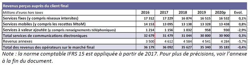 Les revenus pour les services fixes affichent leur première progression “après dix années de baisse continue”, grâce un revenu lié à la vente des abonnements à haut et très haut débit en hausse de 3 % en un an “après deux années de quasi stabilité”. Les revenus pour les services ont vu leur progression ralentir, à 0,8 % en 20220 contre 1,4 % en 2019, principalement en raison de la baisse des déplacements ayant réduit les revenus liés au roaming. En 2020, le revenu associé a perdu plus de la moitié de sa valeur pour atteindre les 260 millions d’euros.