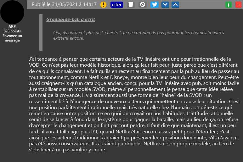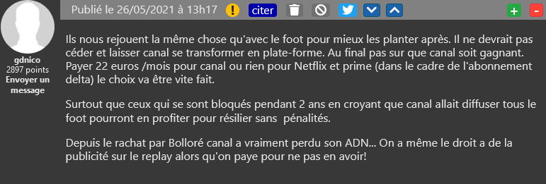 La filiale de Vivendi n’hésite pas à poser son ultimatum face au cinéma français pour obtenir ce qu’elle veut. Une situation qui ne manquera pas de rappeler les exigences de la chaîne cryptée face à la LFP pour un dossier tout aussi brûlant : la diffusion de la Ligue 1. Et pour certains lecteurs, il ne faut pas céder aux requêtes.