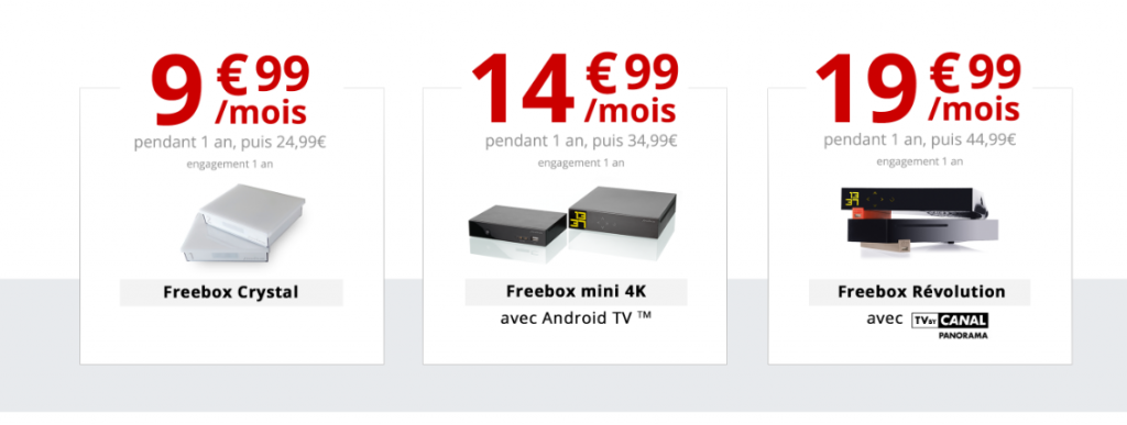 - la Freebox Crystal est affichée à 9,99€/mois pendant un an, puis à 24,99€/mois pour un accès internet et une offre de téléphonie simple