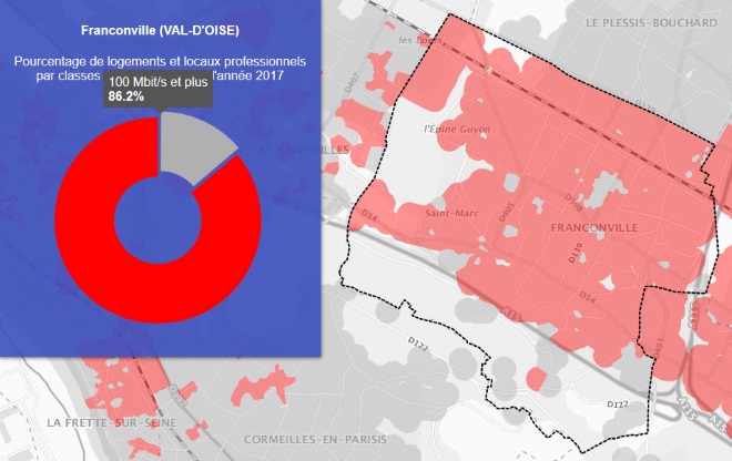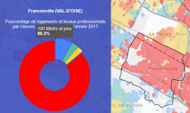 Grâce à la première carte on peut voir que la ville de Franconville est couverte à 86.2% par le très haut débit.