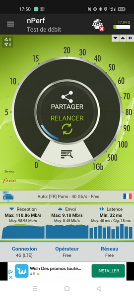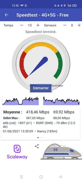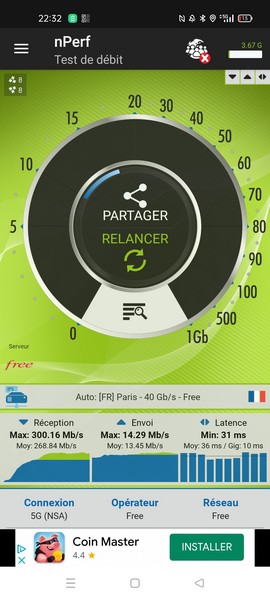 La 5G, c’est l’argument mis en avant dans le nom du smartphone et dans la communication du fabricant. Pour vous donner une idée, avec une bonne couverture en intérieur, nous flirtions sans problème avec les 300 Mbit/s en réception et nous téléchargions un gros de jeu de 2 Go 40 Mo par 40 Mo. Autant dire que nous restions en 5G, même à la maison. La 4G 700 MHz est également supportée. Enfin, le Realme 8 5G permet de gérer deux numéros grâce à deux logements Nano-SIM.