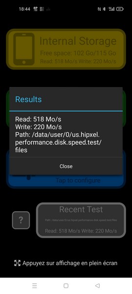 Pour les amateurs de chiffres, l’outil Disk Speed nous donnait une idée des performances de la mémoire interne, à savoir 220 Mo/s en écriture et 518 Mo/s en lecture. Le stockage peut d’ailleurs être étendu par carte MicroSD, grâce à un emplacement dédié. Pas besoin ainsi de choisir entre gestion dual-SIM et extension mémoire.