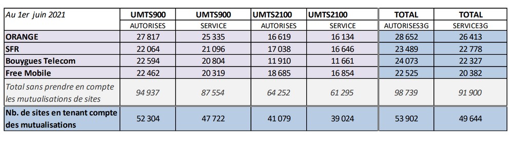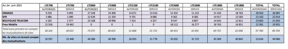 Au 1er juin 2021, 53 634 sites 4G ont été autorisés en métropole (contre 53 368 au 1er mai 2021), dont 49 066 sont déclarés en service (contre 48 781). Ces chiffres se rapprochent de ceux constatés pour le réseau 3G, à savoir 53 902 sites autorisés et 49 644 en service.