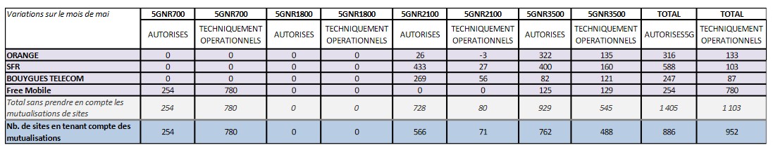 À l’issue du mois de mai 2021, Free Mobile comptait 780 sites supplémentaires opérant sur les 5G, dont 780 sur la bande 700 MHz permettant une meilleure couverture et 129 sur la bande 3,5 GHz offrant de meilleurs débits. C’est deux fois plus que les 323 des rivaux réunis. Dans le détail, on en compte 133 nouveaux pour Orange, 103 nouveaux pour SFR et 87 nouveautés pour Bouygues Telecom.