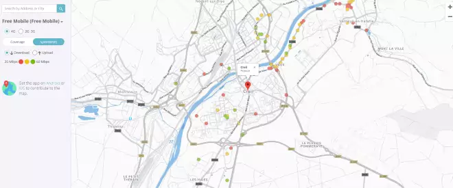 Selon les résultats des tests effectués par les abonnés Free Mobile, les zones rouges ont un débit inférieur à 20Mb/s, pour les zones jaunes le débit est compris entre 20 et 60Mb/s et pour les zones vertes le débit est au dessus de 60Mb/s.