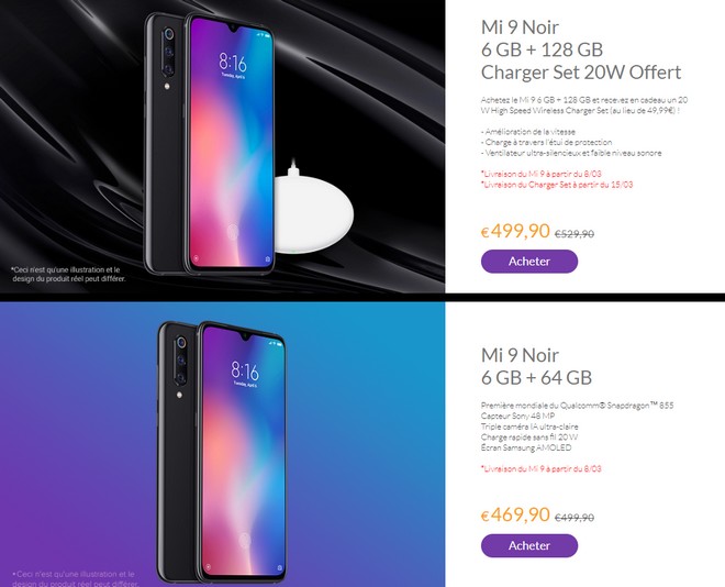 En France, le Xiaomi Mi 9 est à présent disponible en précommande pour des livraisons à partir du 8 mars. On a d’ailleurs le choix entre deux configurations 6/64 Go à 499,90 euros ou 6/128 Go à 529,90 euros. Il y a même des tarifs promotionnels à 469,90 et 499,90 euros dans le cadre du lancement. Notez qu’un chargeur sans-fil 20 Watts est offert avec le modèle 6/128 Go.