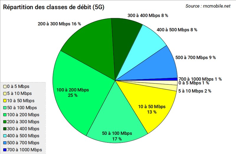 Les mesures 5G à plus de 500 Mbit/s représentent pour l’instant 10 % (9 % entre 500 et 700 Mbit/s et 1 % entre 700 et 1 000 Mbit/s). Celles comprises entre 100 et 500 Mbit/s la grande majorité, avec 57 % (25 % entre 100 et 200 Mbit/s, 16 % en 200 et 300 Mbit/s, 8 % en 300 et 400 Mbit/s et 8 % entre 400 et 500 Mbit/s). Le tiers restant oscille entre 0 et 100 Mbit/s (1 % entre 0 et 5 Mbit/s, 2 % entre 5 et 10 Mbit/S, 13 % entre 10 et 50 Mbit/s et 17 % entre 50 et 100 Mbit/s).