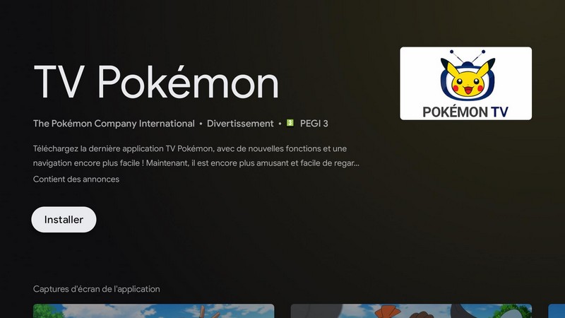 Pour commencer, il faut se rendre sur le Play Store de Google pour récupérer l’application TV Pokémon. Elle pèse moins de 30 Mo. Récente, la dernière mise à jour remonte au 9 mars 2021.