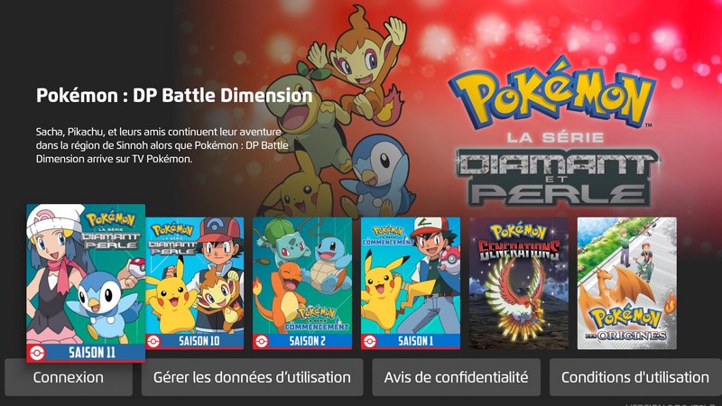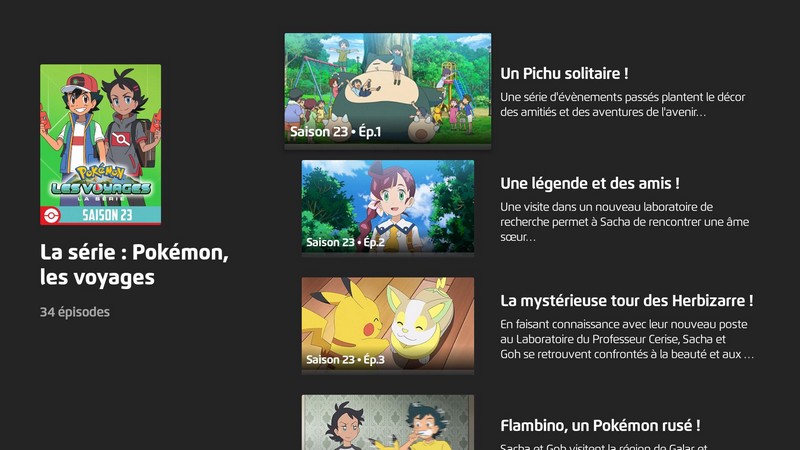 L’interface de TV Pokémon est simple avec des saisons classées par numéro décroissant de saison. Vous remarquerez d’ailleurs que toutes ne sont pas là. On passe en effet de la saison 2 à la saison 10 ou encore de la saison 11 à la saison 20. Il y a en revanche Pokémons Les Origines et Pokémon Générations.