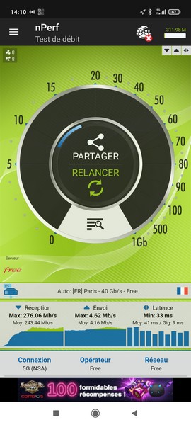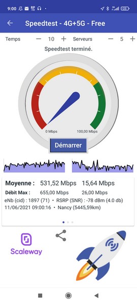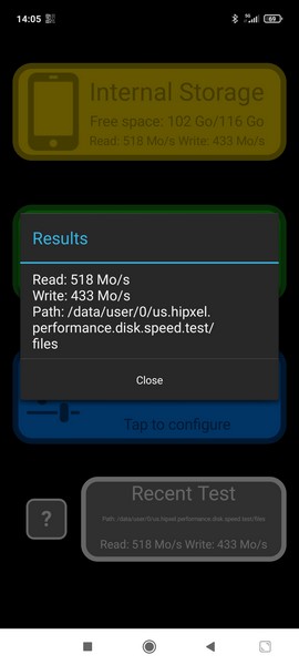 Pour les amateurs de benchmarks, l’outil Disk Speed indiquait 518 Mo/s en lecture et 433 Mo/s en écriture pour la mémoire interne en UFS 2.2. Voilà qui explique la bonne réactivité. Rappelons que ce stockage est extensible, mais au sacrifice de la gestion dual-SIM.