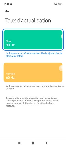 L’écran du Redmi Note 10 5G propose la définition Full HD+ et le taux de rafraîchissement 90 Hz, mais fait l’impasse sur l’AMOLED avec ses couleurs plus vives et ses meilleurs contrastes. La luminosité n’a jamais posé problème pour un usage en extérieur avec une journée très ensoleillée. L’écran du Redmi Note 10 5G opte pour le plus poinçon plutôt que l’encoche goutte d’eau, mais on l’aurait préféré dans le coin supérieur gauche, afin qu’il soit plus facilement hors du champ de vision en vidéo ou en jeu et donc plus facile à oublier. Les paramètres permettront de régler la chaleur d’affichage, mais également le taux de rafraîchissement selon vos besoins (60 ou 90 Hz).
