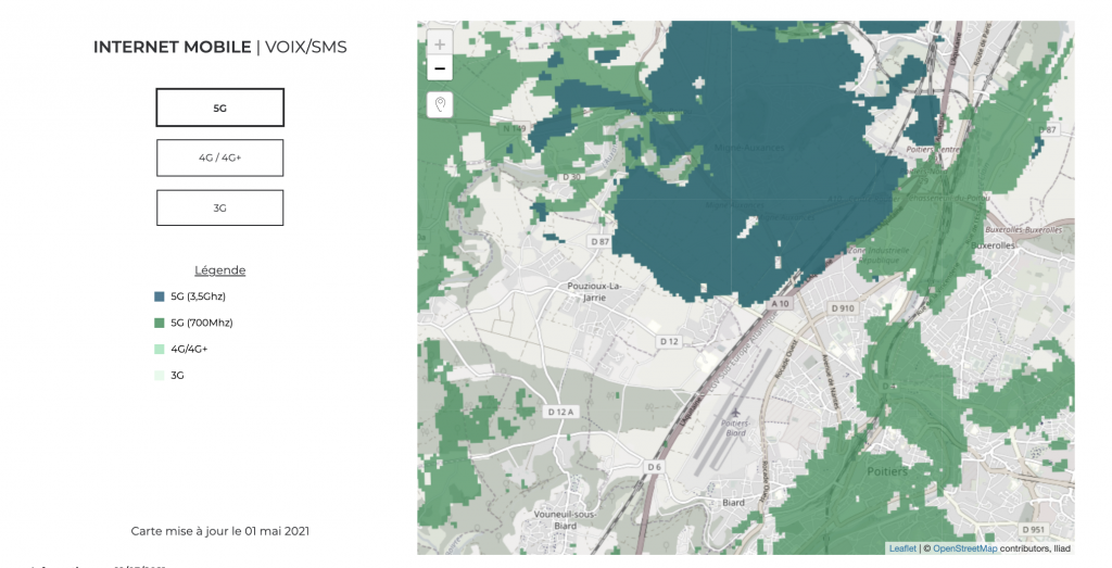 La carte interactive de Free Mobile se met à jour, enfin pas totalement Les données de couverture 3G/4G/5G viennent d’être actualisées sur le site de Free Mobile, pour indiquer plus précisément la disponibilité des différentes technologies. Ainsi, vous pouvez dorénavant retrouver l’état de la couverture de Free au 1 mai dernier, contre le 13 avril auparavant. On regrettera que l’opérateur n’ait pas mis à jour ses données à début juin.