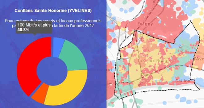 Grâce à la première carte on peut voir que la ville de Conflans-Sainte-Honorine est couverte à 45.6% par le très haut débit.
