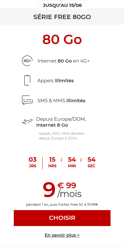 Retour sous barre des 10€ par mois. Le prix de l’offre intermédiaire de Free a été revu à la baisse, après avoir augmenté en début de mois. Il pour bénéficier de 80 Go en 4G et 8Go à l’étranger, il faudra désormais débourser 9.99€/mois contre 11.99€ précédemment. L’offre est toujours valable jusqu’au 15 juin prochain.