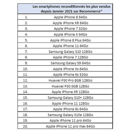 Avec les iPhone 8 64 Go, iPhone 7 32 Go et iPhone X 64 Go, la boutique Free Mobile propose trois des smartphones reconditionnés les plus vendus par Recommerce. Ces modèles Apple occupent en effet les 1ère, 3e et 4e places dans un Top 20 pour janvier-juin 2021 que vient de publier son partenaire et spécialiste du reconditionné. Ou bien cinq sur vingt, si l’on compte le Galaxy S9, une ancienne référence haut de gamme de Samsung occupant la 9e place, et l’iPhone 7 128 Go, en 8e place.