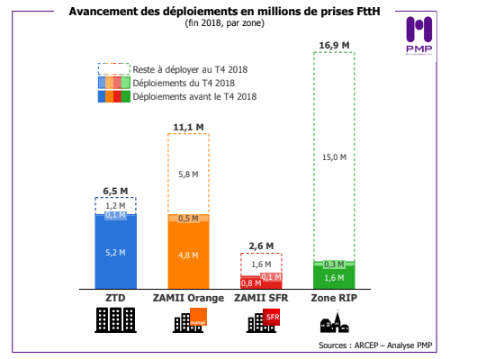 Sur les quatre derniers trimestres, 3 212 000 locaux supplémentaires ont été rendus raccordables au FttH, dont 1 013 000 au T4 2018. Au 31 décembre 2018, 13,56 millions de locaux étaient éligibles aux offres FttH, soit une hausse de 32 % en un an. En se basant sur les donnés du régulateur, le cabinet de conseil PMP a réalisé des graphiques très parlant de l’avancement des déploiement en millions de prises FTTH à fin 2018 par zone.