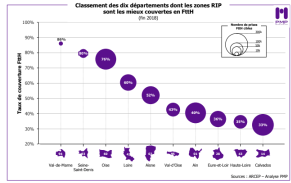 Les trois principales zones AMII départementales les mieux couvertes en FttH hors Île-de-France sont le Calvados, la Gironde et le Bas-Rhin. "Parmi les dix zones AMII à l’échelle départementale les mieux couvertes de France, toutes le sont au moins aux deux tiers de la cible et huit se situent hors de l’Ile-de-France. Six de ces zones AMII représentent plus de 100 000 prises FttH cibles", commente enfin PMP.