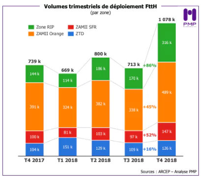 Sur les quatre derniers trimestres, 3 212 000 locaux supplémentaires ont été rendus raccordables au FttH, dont 1 013 000 au T4 2018. Au 31 décembre 2018, 13,56 millions de locaux étaient éligibles aux offres FttH, soit une hausse de 32 % en un an. En se basant sur les donnés du régulateur, le cabinet de conseil PMP a réalisé des graphiques très parlant de l’avancement des déploiement en millions de prises FTTH à fin 2018 par zone.
