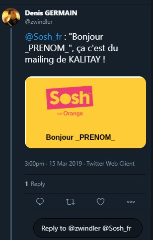 La petite bourde a globalement été prise avec humour par les abonnés parlant d’un "mailing de KALITAY" ou répondant "Bonjour _OPERATEUR_". L’un d’eux a même proposé sa candidature pour un poste de développeur chez Sosh. À bons entendeurs, on vous glisse le lien…