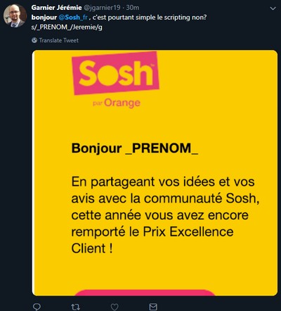 Sur Twitter, des abonnés Sosh rapportent un e-mail un peu étrange qui leur a été envoyé par leur opérateur. Dans le texte, on peut en effet voir "Bonjour _PRENOM_". Un script prévu pour ajouter le prénom n’a visiblement pas fonctionné.
