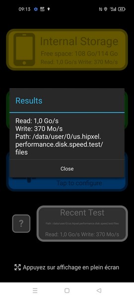 Pour revenir au stockage interne, voici justement un test des vitesses en écriture et en lecture réalisé avec l’outil Disk Speed. Nous avons obtenu 370 Mo/s en écriture et 1 Go/s en lecture. Notez d’ailleurs que ce stockage n’est pas extensible par carte MicroSD.