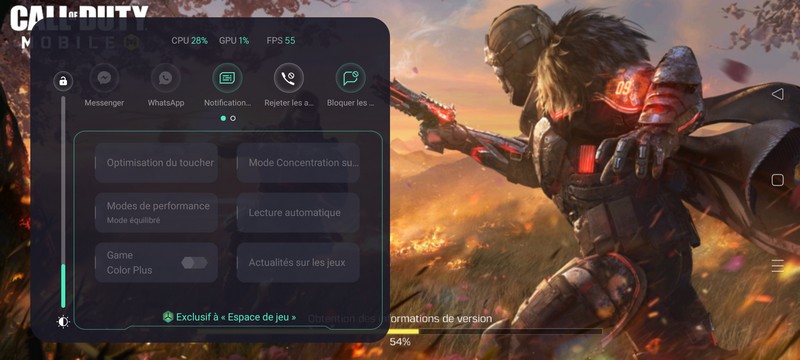 - L’Espace de jeu pour gérer ses jeux installés, ainsi que l’expérience en pleine partie (performances, luminosité, notifications, appels, etc.).