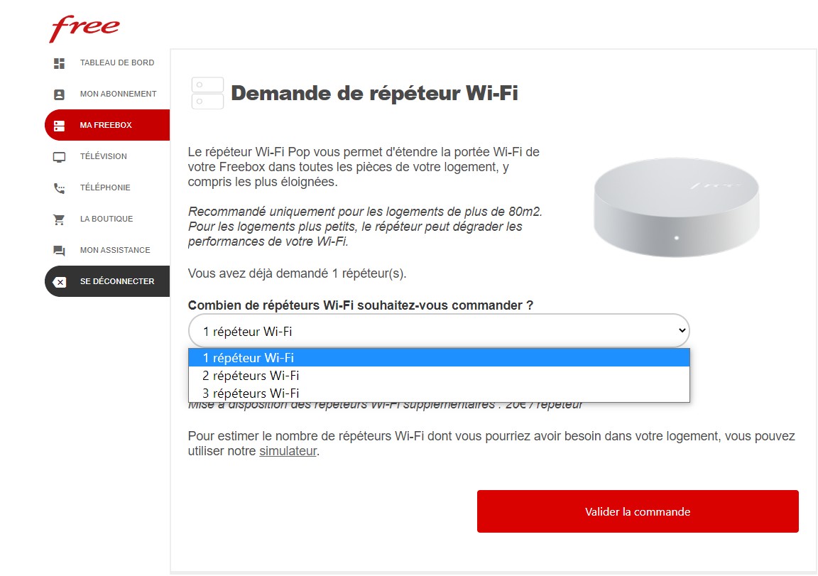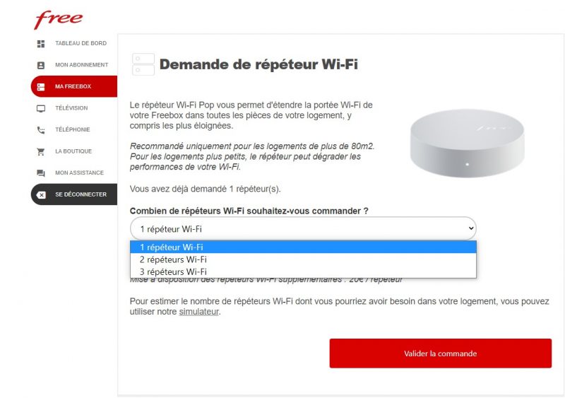 Si besoin, des répéteurs Wi-Fi supplémentaires peuvent ainsi être commandés, dans la limite de 3 et moyennant 20 euros par exemplaire. Cela se passe dans l’espace abonné Freebox, depuis la section “Ma Freebox/Commander un répéteur Wi-Fi.