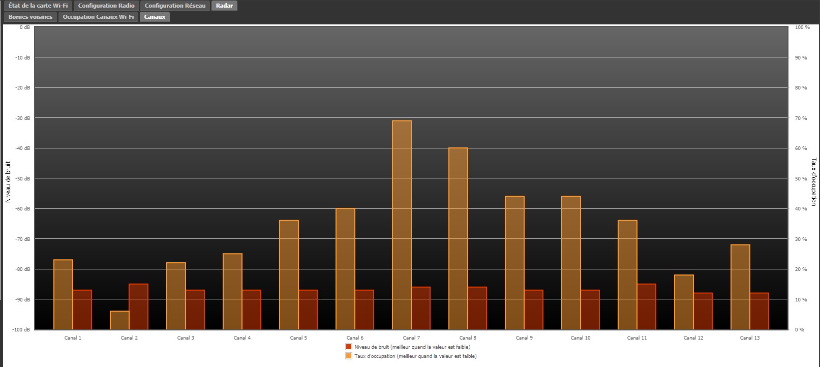 De là, cliquer sur “Radar” dans la partie supérieure de l’écran, puis sur “Canaux”. Un graphique vous permettra alors de repérer les canaux Wi-Fi les moins encombrés et les moins perturbés, où il sera ainsi plus judicieux de positionner.
