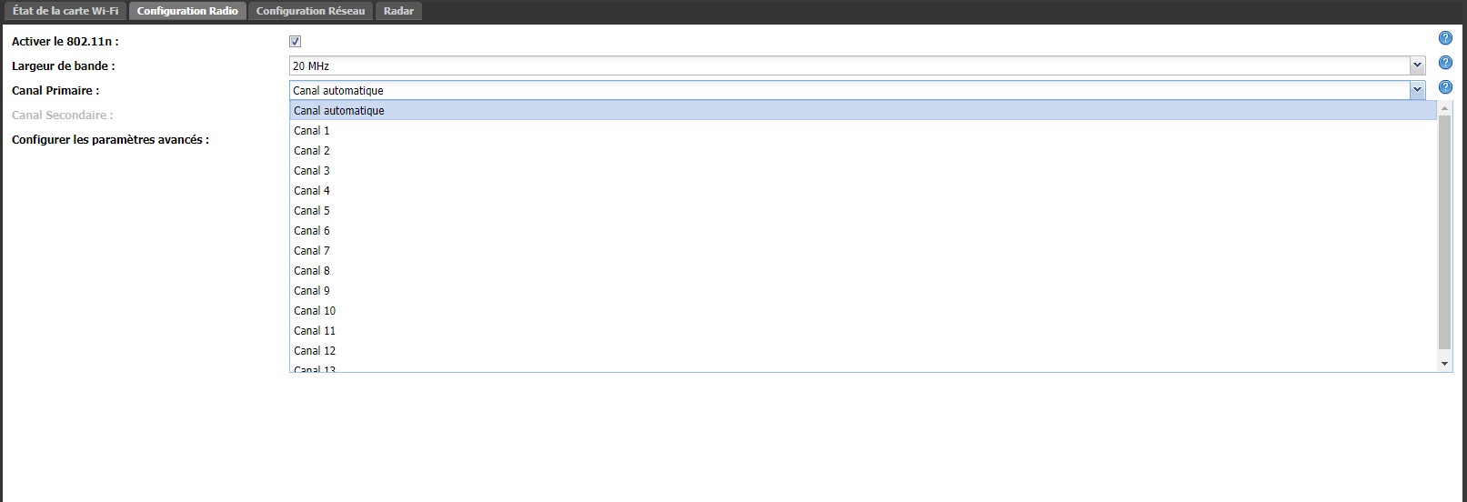 Cliquez ensuite sur “Configuration radio”. De là, il sera possible de définir le canal primaire de votre choix, au lieu d’un canal choisi automatiquement.