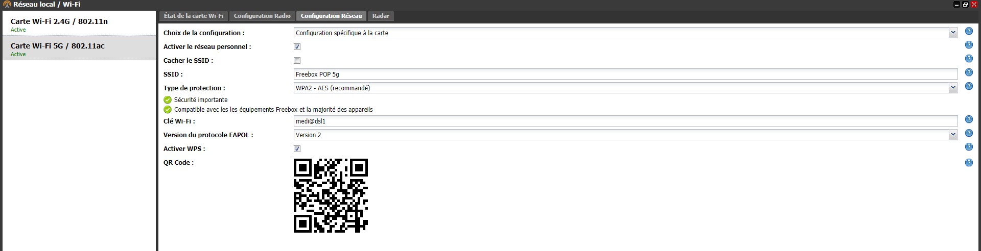 Cela se passe de nouveau dans l’interface Freebox OS et la section Wi-Fi. Dans la partie gauche de l’écran, deux cartes Wi-Fi apparaissent : une carte 2,4 GHz utilisant des fréquences basses pour une meilleure pénétration des murs et une meilleure couverture dans un logement plutôt étendu, et une carte 5 GHz permettant des débits plus élevés en contrepartie d’une portée moins importante. Il suffit de cliquer sur chacune d’entre elles, puis “Configuration réseau”, puis de sélectionner “Configuration spécifique à la carte” dans le menu déroulant “Choix de configuration”. Pour chaque carte Wi-Fi, vous pourrez ainsi définir un nom et un mot de passe spécifique, de manière à vous connecter au réseau Wi-Fi le plus adapté. Notez que vous pourrez imprimer le QR Code à scanner avec l’appareil photo du smartphone pour faciliter la connexion pour vos invités.