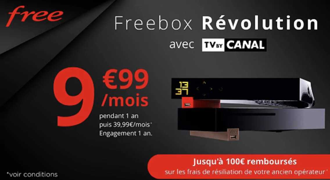 Offre de remboursement réservée aux personnes souscrivant à l’offre Forfait Freebox Révolution avec TV by CANAL Panorama au tarif promotionnel vente-privée de 9,99€/mois pendant 1, puis 39,99€/mois. Remboursement par virement dans la limite de 100€ TTC. Toute demande incomplète, illisible ou envoyée après le délai indiqué ne sera pas prise en compte.