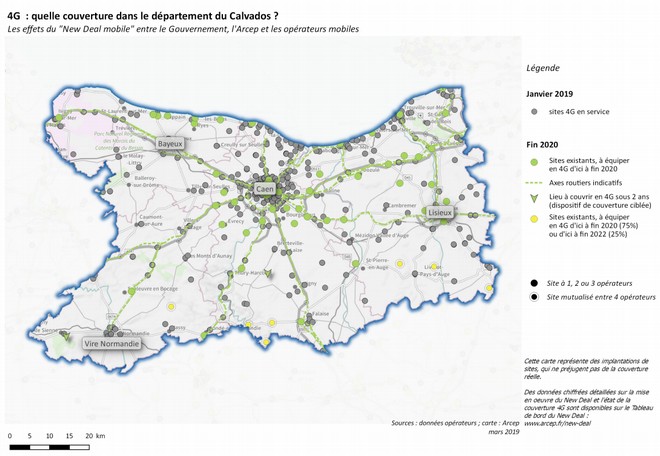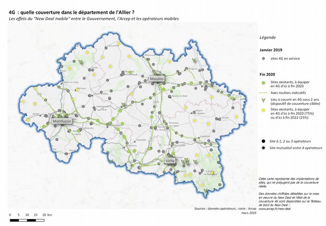 Pour permettre à tout un chacun de se rendre compte des effets concrets du New Deal Mobile, l’Arcep a mis en ligne un altas. Celui-ci regroupe les cartes de la 4G par département. Il montre les sites 4G déjà en service, les sites existants à équiper en 4G d’ici à fin 2020 ou fin 2022, les sites à 1, 2 ou 3 opérateurs et les sites mutualisés à 4 opérateurs.