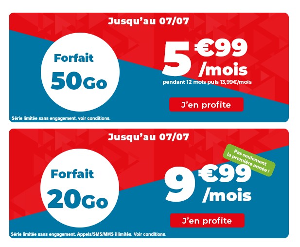 Coûtant 5,99 euros par mois, le premier inclut les appels, SMS et MMS en illimité, ainsi que 50 Go de data pour l’Internet mobile (débit ajusté au-delà) avec des débits 3G/4G (selon la couverture disponible). Pour le roaming, 9 Go sont prévus depuis l’Union européenne et les DOM. Le tarif passe à 13,99 euros après 12 mois.