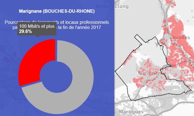 Grâce à la première carte on peut voir que la ville de Marignane est couverte à 35.4% par le très haut débit.