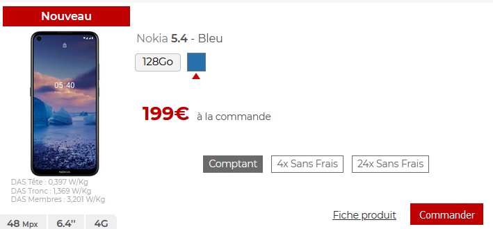 Il s’agit du Nokia 5.4 proposé à 199 euros dans une capacité 128 Go et un coloris bleu. On peut également l’acquérir en 4x sans frais (52 euros à la commande, puis 3 fois 49 euros) ou 24 fois sans frais (31 euros à la commande, puis 24 fois 7 euros)