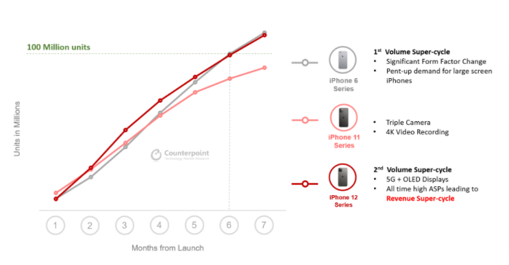 D’après le cabinet spécialisé, Apple effectue avec l’iPhone 12 un second « Super-Cycle » des volumes de vente après le précédent réalisé avec les ventes d’iPhone 6. L’écran OLED, la 5G et les autres améliorations proposées par la gamme iPhone 12 ont en partie fait son succès.