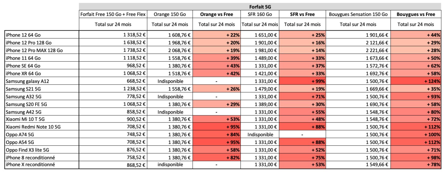 Free Flex comparée au subventionnement mobile d’Orange, Bouygues et SFR : des différences de prix énormes
