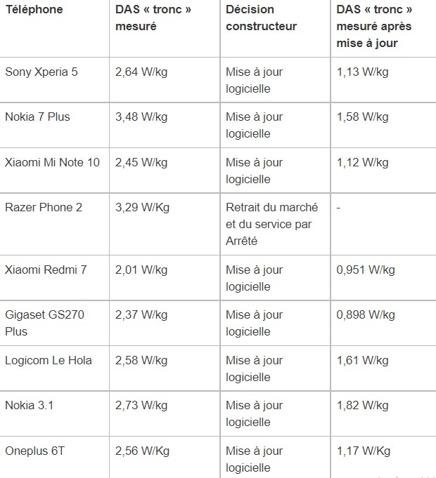 Dans le lot, certains ne respectaient ainsi pas totalement la réglementation en matière de DAS. 9 pour être précis, soit environ 10 %. Après mise en demeure, 8 sont toutefois revenus dans les clous grâce à une mise à jour logicielle : les Sony Xperia 5, Nokia 7 Plus, Xiaomi Mi Note 10, Xiaomi Redmi 7, Gigaset GS270 Plus, Logicom Le Hola, Nokia 3.1 et OnePlus 6T. Un seul, le modèle Razer Phone 2, a finalement fait l’objet d’“un rappel volontaire auprès des personnes détentrices de ce terminal” et d’un retrait du marché.
