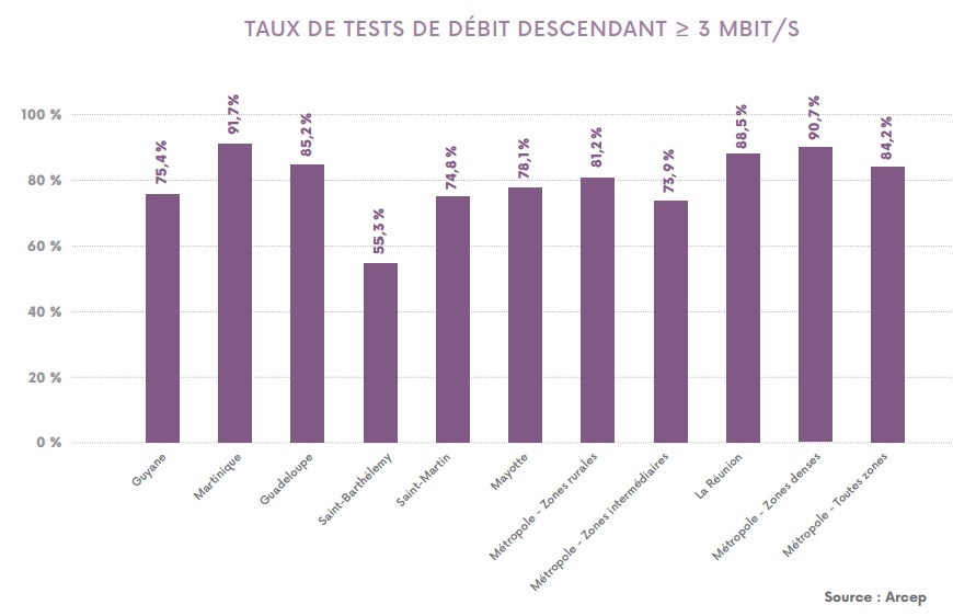 Dans le détail, la proportion des utilisateurs dépassant les 3 Mbit/s en liaison descendante (téléchargement/réception) atteint les 81,2 % en zone rurale, 73,9 % en zone intermédiaire et 90,7 % en zone dense.