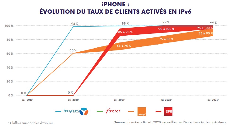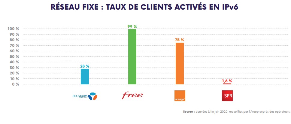 Sur les réseaux fixes, Free et Orange font figure de bons élèves avec respectivement 99 et 75 % des abonnés ayant migré vers l’IPv6 au 30 juin 2020. Dans le cas de Free, les 100 % devraient d’ailleurs être atteints à la mi-2023. À la même période, le taux de clients en IPv6 devrait osciller entre 85 et 95 % pour Orange.